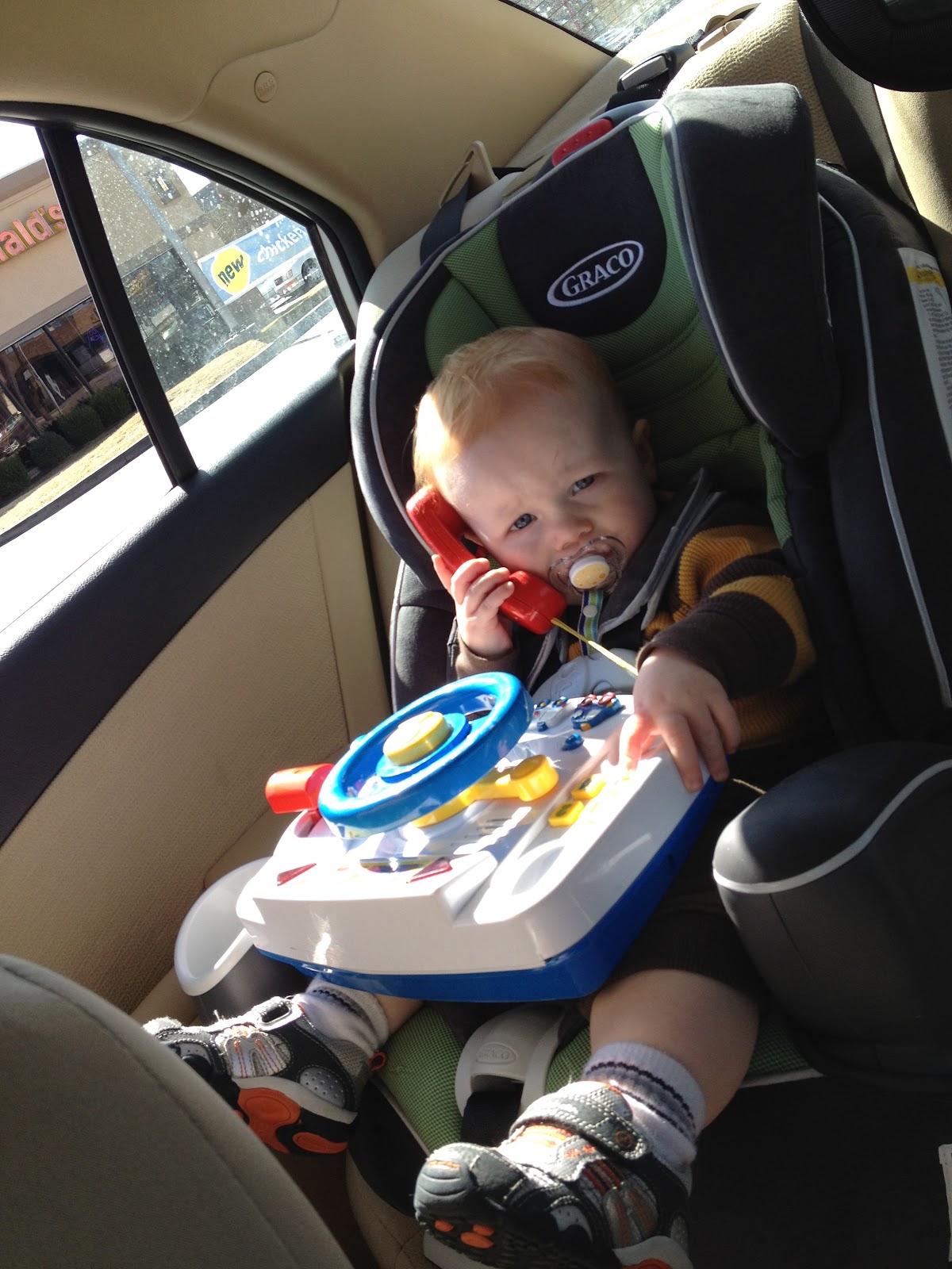 Henry has discovered climbing. He climbs on furniture and boxes and dishwashers and stairs, and anything that his brain believes is worth climbing. He's also discovered his balance and can take steps up and down small stairs without falling (usually) and before turning around to descend a staircase, will take a few minutes to see if the banister or rail will help him descend without resorting to hands and knees. It's adorable, but really really terrifying. He also understands and can sometimes make sounds for a cow, chicken, sheep, elephant, monkey, dog, bird, and cat. He says "balloon" regularly and before that, his favorite word was "ball" and now uses them fairly interchangeably. It's probably my fault because all the balloons we have aren't actually inflated with helium, so they're pretty much really light balls anyway. Henry will wave at the phone when he sees me talking on it, probably assuming Dad is on Face Time. He has an adorable little wave. He understands going outside and upstairs, and will start pointing at the front door making his "question" sound if he hears me mention any of the words. He uses baby signs for: more, food, milk, nap time (or it could be his blanket), all done, and pacifier. He likes to watch Little Einsteins and will pat/clap along with them (sometimes) and as of late, thinks it's hilarious to pat and raise his arms in the air because we say "Blast off!" when he does it.